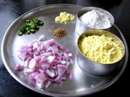 Meanwhile, prepare the other ingredients - 1 small chopped onion, 2 green chillies (adjust to taste), ½ teaspoon jeera, 1 teaspoon grated ginger, 1-2 tablespoon besan / chickpea flour and 1-2 tablespoon of rice flour