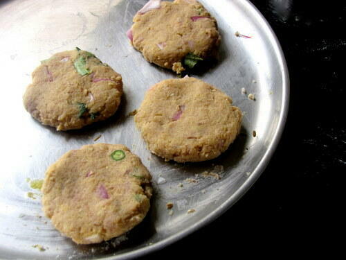 Flatten into small discs that are not too thick. While shaping, if the mixture is too thick, dip fingers into a bowl of water and try to shape. If the mixture is watery, add some besan or rice flour.