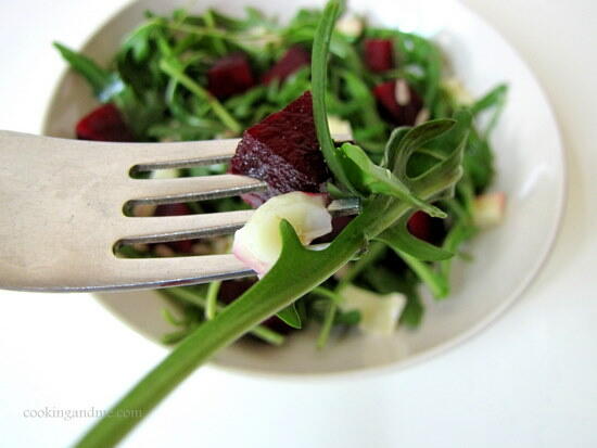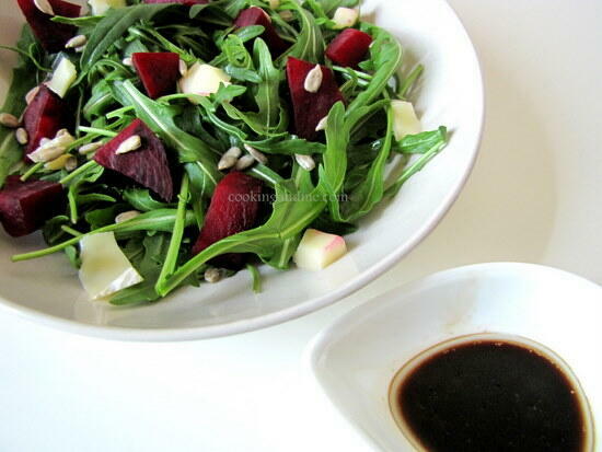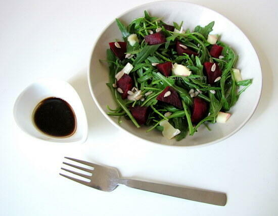 Beetroot Rocket Salad with BrieServes 2What I Used:4 cups lightly packed rocket lettuce leaves1 small beetroot, cubed and steamed until cooked yet firmBrie cheese cut into small piecesToasted sunflower seeds (the original recipe used pine nuts)For the dressing:2 tablespoon balsamic vinegar1 tablespoon extra virgin olive oil½ teaspoon sugarA pinch of saltToss the salad leaves and other ingredients together. Mix the ingredients for the dressing well and combine just before serving.