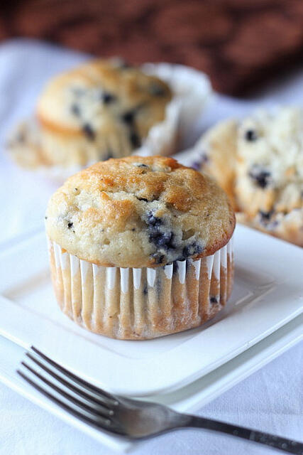 3. In another large bowl, whisk together the flour, sugar, baking powder, baking soda, and salt. Remove 1 tablespoon of the dry ingredients and toss it with the blueberries. If using frozen blueberries, do not thaw before adding them to the batter. With a rubber spatula fold the wet ingredients into the dry ingredients and stir only until the ingredients are combined. Gently stir in the blueberries. Do not over mix the batter or the muffins will be too tough and hard.