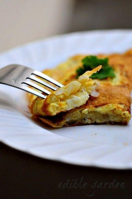 You can really get creative here. I have topped omelettes with vegetarian sausages, onions, tomatoes, mushroom, spinach, spring roll filling, boiled and grated potatoes, etc.