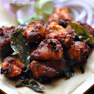- Drain and add curry leaves to the fried pieces of chicken. Give everything a quick stir and serve hot with lemon wedges and raw sliced onions