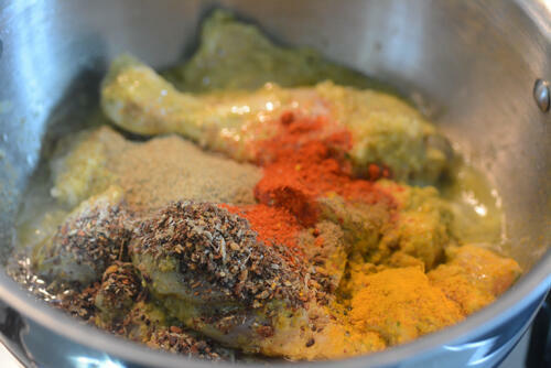 Now, in the same pan used for frying the onions, top up the remaining ¼ cup ghee (see notes). Add the marinated chicken pieces and mix well.