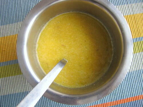 1. Roast and grind all the ingredients under that list. In a pan, add this ground masala along with the tamarind juice and salt. Bring to boil and let it simmer for 5 mins. The gravy shouldnt get too watery nor too thick, the consistency should be thicker than rasam but thinner than kozhambu.