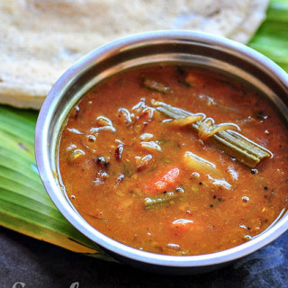 Sambar in Kerala is quite simple. There aren't many kinds like in Tamil Nadu where sambar usually has one or two vegetables and the flavours are adjusted a bit according to the vegetable added. In this Kerala sambar recipe which amma and athamma make, we add carrots, potatoes, drumsticks, onions or shallots, and sometimes capsicum too. This sambar can be served with rice, idli, and dosa and the amount of tamarind is adjusted to accordingly.