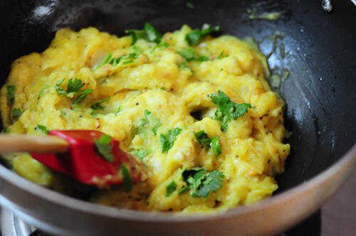 - Mash the potatoes without any large lumps and add to the above mixture. You can add a couple tablespoons of water. Mix it well and cook until the mixture thickens.