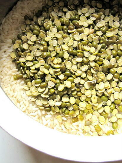 You'll need some good quality halved green gram and normal rice that you use every day. I bought this green dal from Bombay and it was so fresh and shiny and dirt-free!