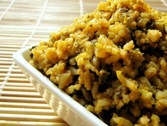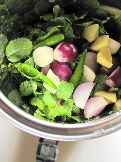 Palak Khichdi RecipeSource: Geetha PerimaServes: 2 to 3What I Used:2 cups rice1 cup halved green dal (always use 2:1 ratio for rice:dal)1 bunch green spinach, chopped fine1 large onion, chopped1 teaspoon jeera/cumin¼ teaspoon turmeric powder½ teaspoon red chilli powder½ teaspoon garam masala or goda masala1 teaspoon ghee (optional)1 tablespoon oilSalt to tasteTo grind:1 cup loosely packed fresh coriander leaves½ cup loosely packed mint leaves2 green chillies, or to tasteA 1" piece of ginger4 cloves of garlic2 tomatoes5-6 pearl onions/shallotsHow I Made It:1. Wash and soak the dal and rice together for 30 mins.2. Grind all the ingredients under the 'to grind' list adding no water.3. Heat the oil in a pressure cooker pan and add the jeera. When it splutters, add the chopped onion. Fry until golden brown. Then add the chopped spinach and stir until soft and wilted.4. To this, add the ground paste and mix well with salt, turmeric, red chilli powder and garam masala. Let it cook for a min.5. Now add the soaked rice and dal. Add 4 cups water. Cook for 4-5 whistles in the pressure cooker. If you are using a normal pan, make sure you cook covered until the rice and dal is cooked thoroughly.6. While hot, mix in 1 teaspoon ghee and serve.