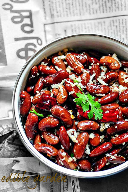 Rajma is one of those things you have to soak before cooking, there's no two ways about that (I do hope someone proves me wrong on this though). Soaking and pressure cooking is the way to start most sundal recipes and htis is no exception. However, I find that I prefer a generous dose of dry red chillies in my rajma sundal than green chillies which are sometimes preferred in sundal recipes.