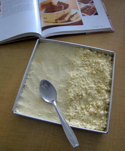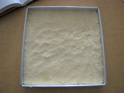 Pat firmly on to a brownie tray or the flattest baking pan you have. Make sure that this layer is not more than 1 to 1.5 inches high. Press with the back of a spoon to layer it firmly.