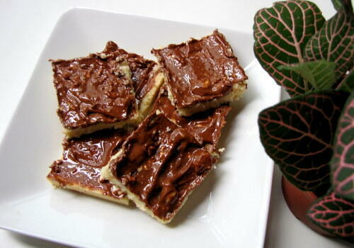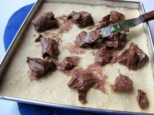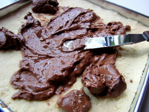 With an icing spatula or a flat spoon, spread the chocolate evenly over the baked base.