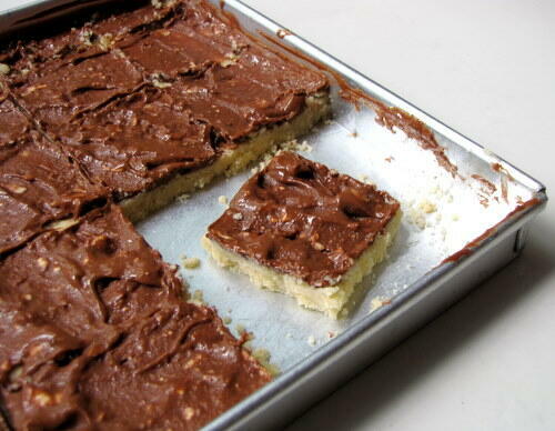 Toblerone Candy Bar ShortbreadMakes about 15 -18 barsAdapted from: A Passion for Baking by Marcy GoldmanIngredients:1 cup butter, at room temperature(I used salted butter. If using unsalted, then add a pinch of salt to the flour)⅔ cup sugar2 ¼ cups flour100gm Toblerone chocolate bar, at room temperature