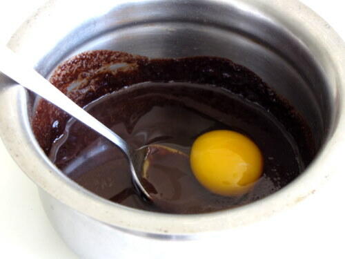 Once the chocolate-butter mixture has slightly cooled, add 2 eggs, mixing well for a minute after each addition.