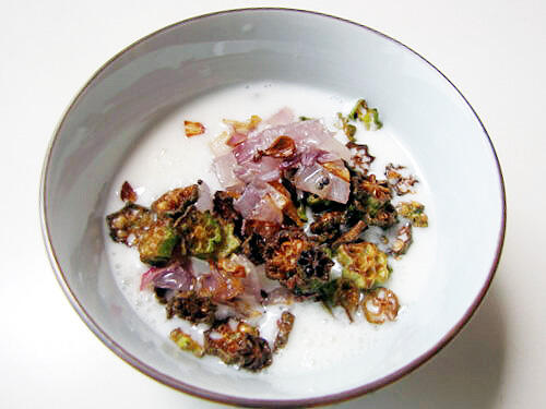 Heat oil, add mustard seeds and when they pop, add the onions, green chilli and okra. Fry for 8-10 mins until the onions are golden and the okra is fried and crisp. Drain and leave aside to cool.